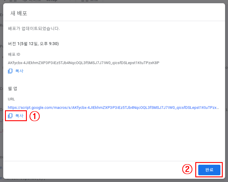 ① 웹 앱 URL을 복사합니다. (복사된 URL를 바로 사용하지 않는경우 메모장에 저장해 두세요.)