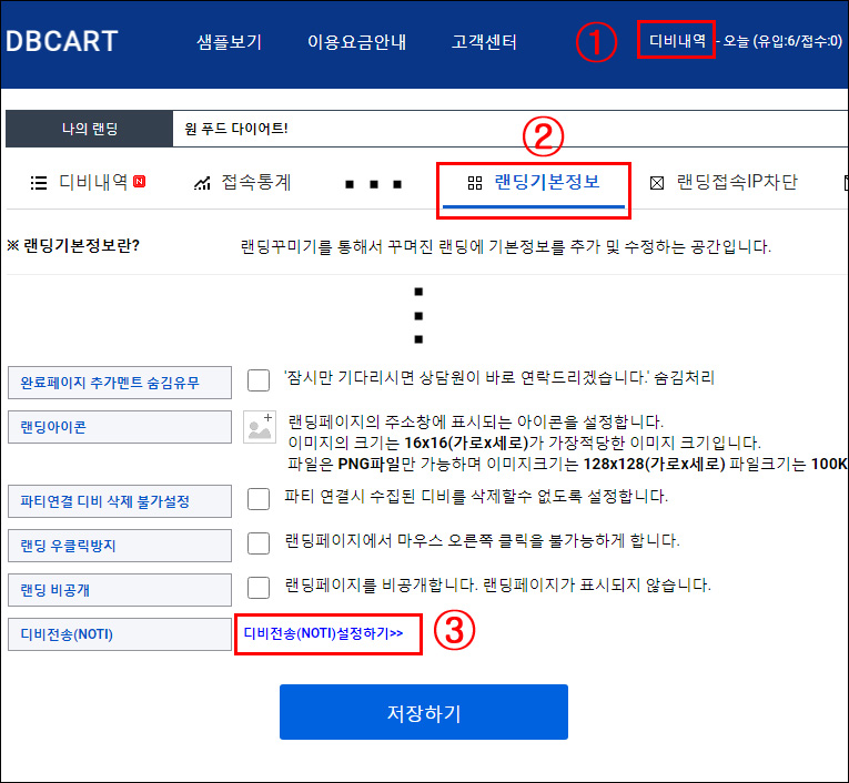 ① 디비내역 > ② 랜딩기본정보 > ③ 디비전송(NOTI) 선택합니다.