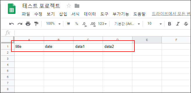 ⅰ구글 스프레드시트에 title,date,data1,data2 4개의 값을 이미지처럼 등록합니다.(알파벳 좌우 여백 꼭 확인 - 여백이 들어가면 데이터오류가 납니다.)