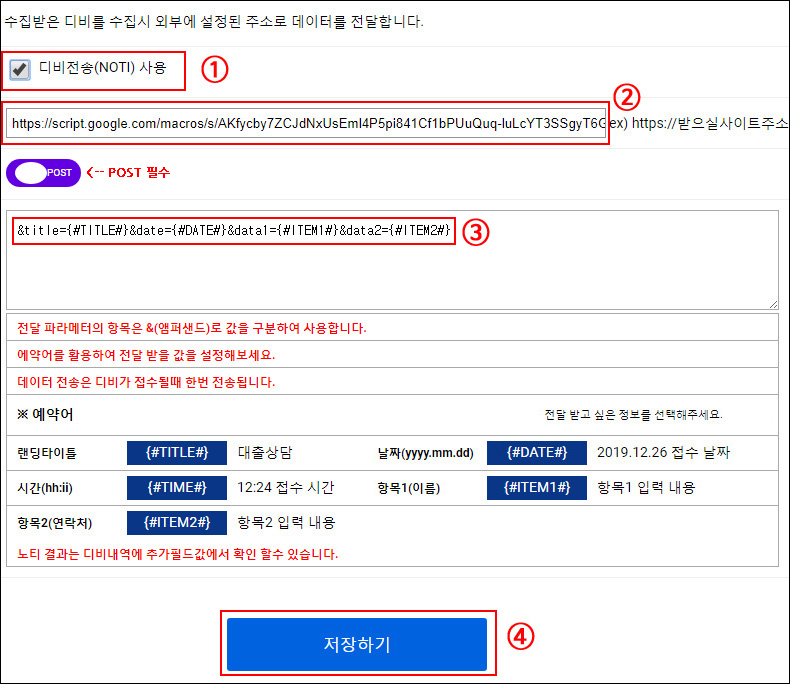 ② 수신주소 : 구글 스프레드시트 '웹 앱 URL' 입력 (해당 포스팅 내용 : 8-3 참조)