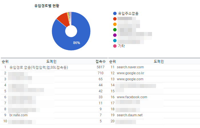 디비카트 랜딩페이지를 통해서 유입된 사용자들의 유입경로 순위 및 그래프 점유율 통계를 표시하였습니다.