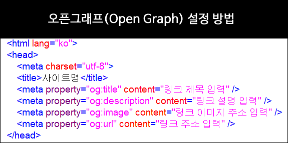 1. 링크 제목 : <meta property='og:title' content='링크 제목 입력'>