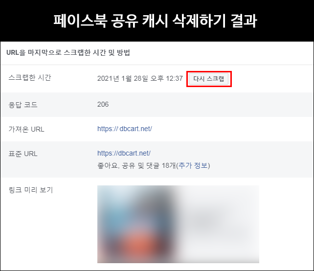 넷째. 페이스북 공유 캐시 삭제하기 결과