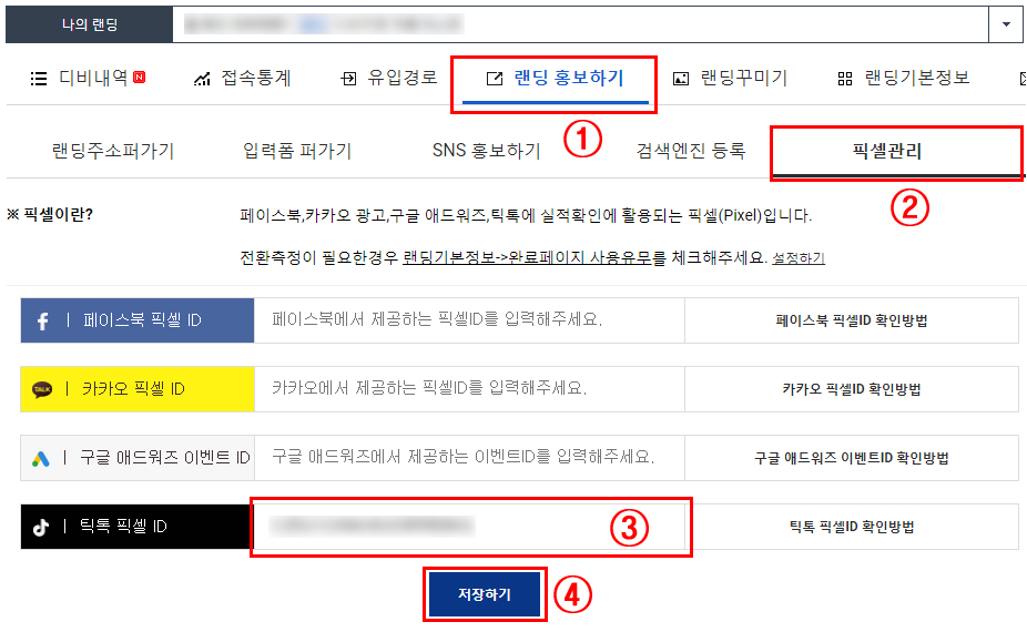 [위치] ①랜딩 홍보하기 > ②픽셀관리 > ③틱톡 픽셀ID를 등록 후 ④저장하기 선택합니다.