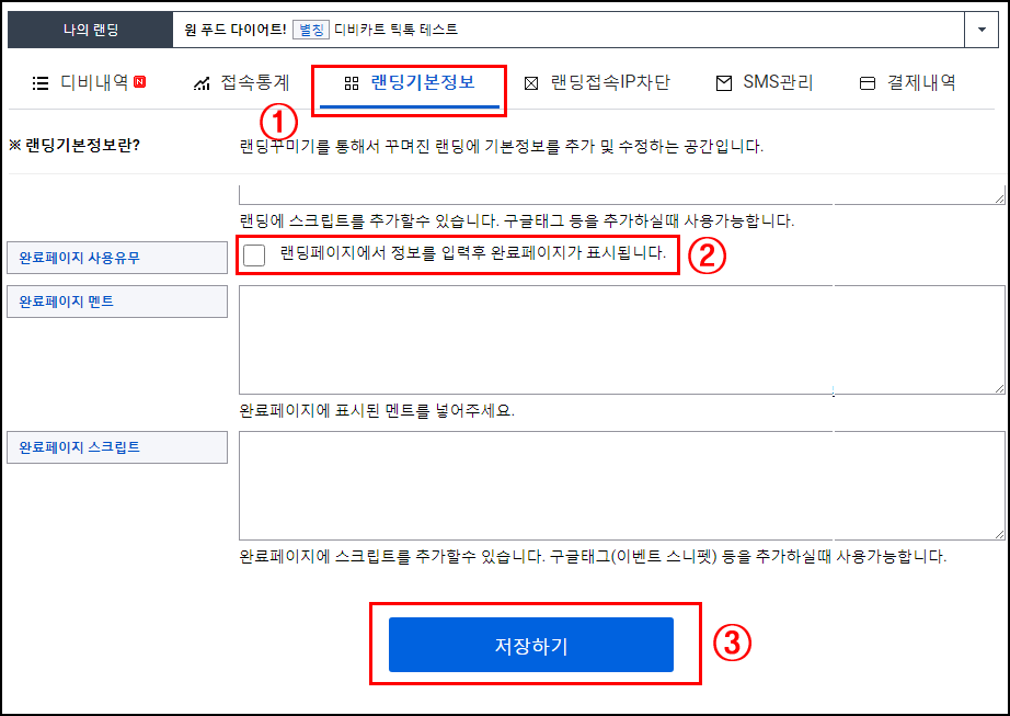 [위치] ①랜딩기본정보 > ②완료페이지 사용유무 체크 > ③저장하기 선택합니다.