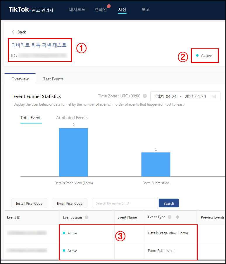 3-3 3-1,3-2 단계를 거치면 일정시간(1~5분)사이에 픽셀관리에서 아래와 같이 정상적으로 픽셀 및 이벤트 픽셀 여부를 확인이 가능합니다.
