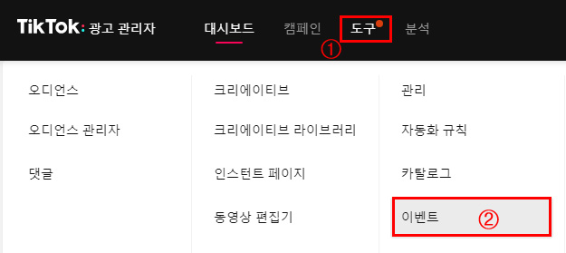 2. 로그인 후 광고 관리자에서 픽셀 등록을 위해 ① 도구 => ② 이벤트 선택해주세요.