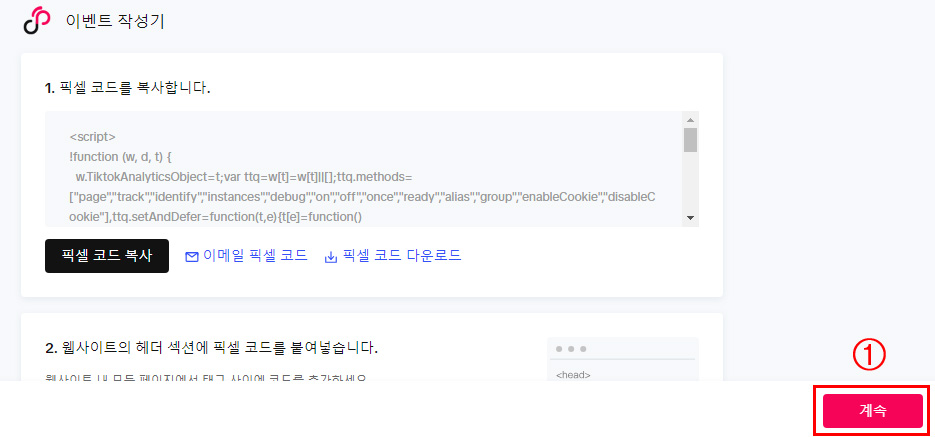 10. 픽셀코드가 확인이 되면 이벤트 작성을 위해서 다음단계를 진행합니다.