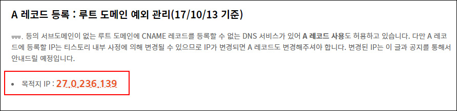 아래는 네이버 블로그, 티스토리 블로그에서 루트 도메인을 연결시 A레코드를 사용하라고 명시 되어 있으며 아래와 같이 아이피를 지원하고 있습니다.