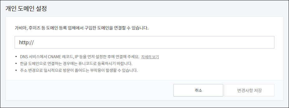 이처럼 서비스하는 업체에서는 개인 도메인을 등록할 수 있도록 지원하고 있습니다.
