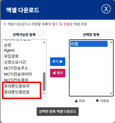 추가 위치 : 디비 내역 -> 항목별 엑셀 다운로드 -> 휴대폰 인증 유무/휴대폰 인증번호