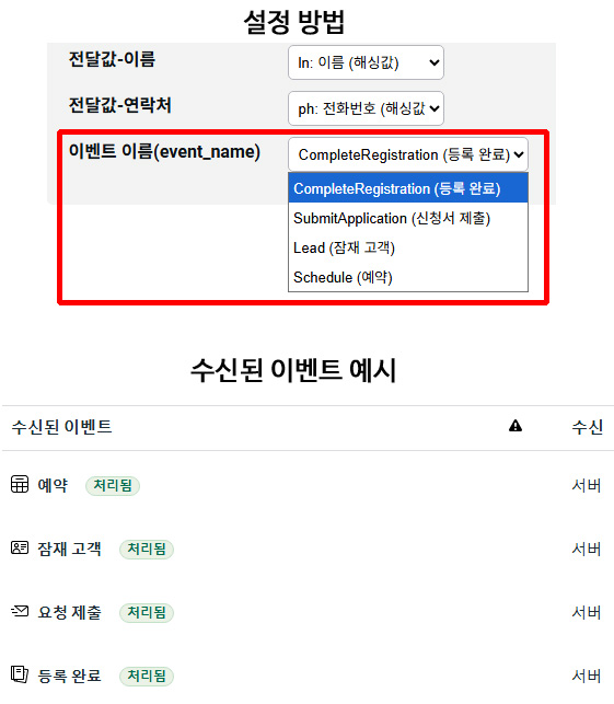 추가 위치(페이스북) : 랜딩 홍보하기->픽셀 관리->FACEBOOK API 연동 ->이벤트 이름(event_name)