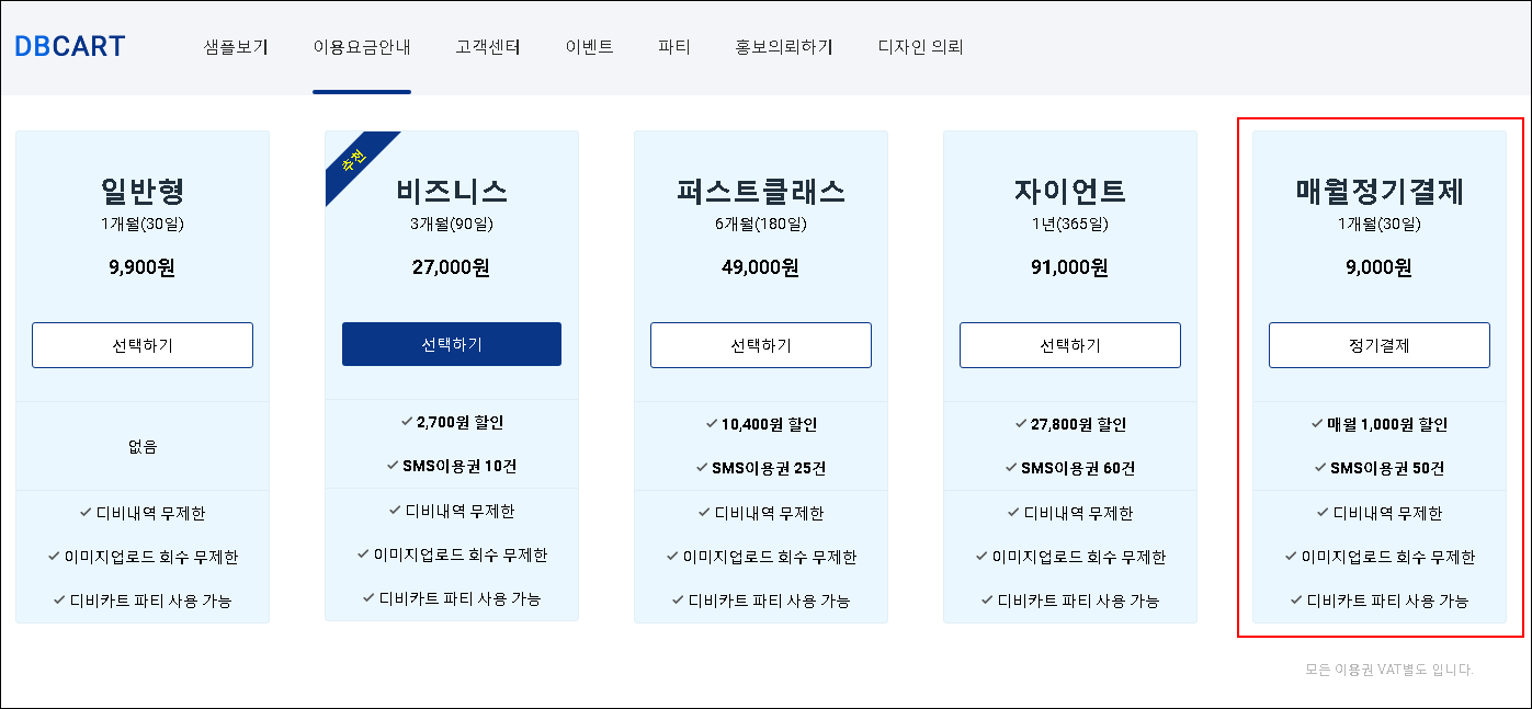 [정기결제 위치] 이용요금 안내 > 매월정기결제 (https://dbcart.net/charge.html)