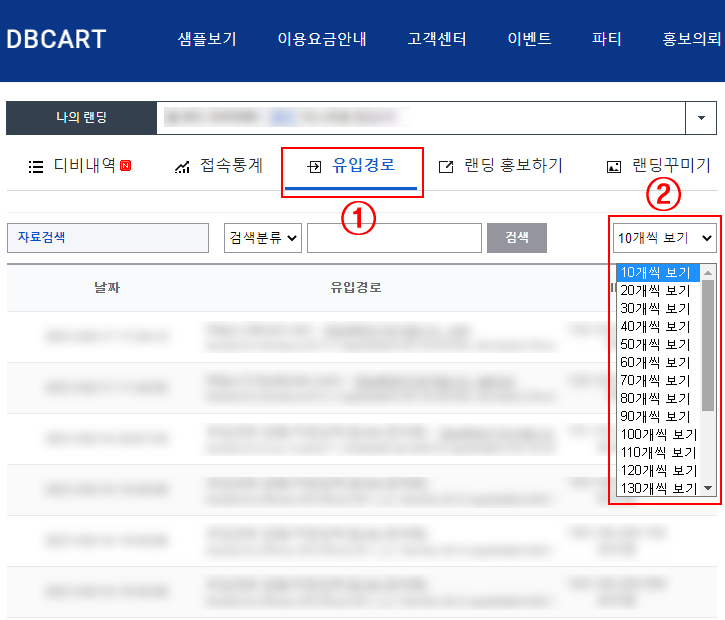 ② 한 페이지 표시되는 개수를 선택할 수 있습니다.
