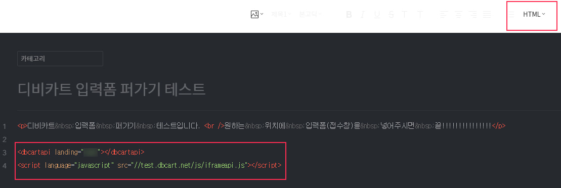 둘째 포스팅 할 블로그에 HTML모드로 변경 후 입력폼 소스 붙여넣기