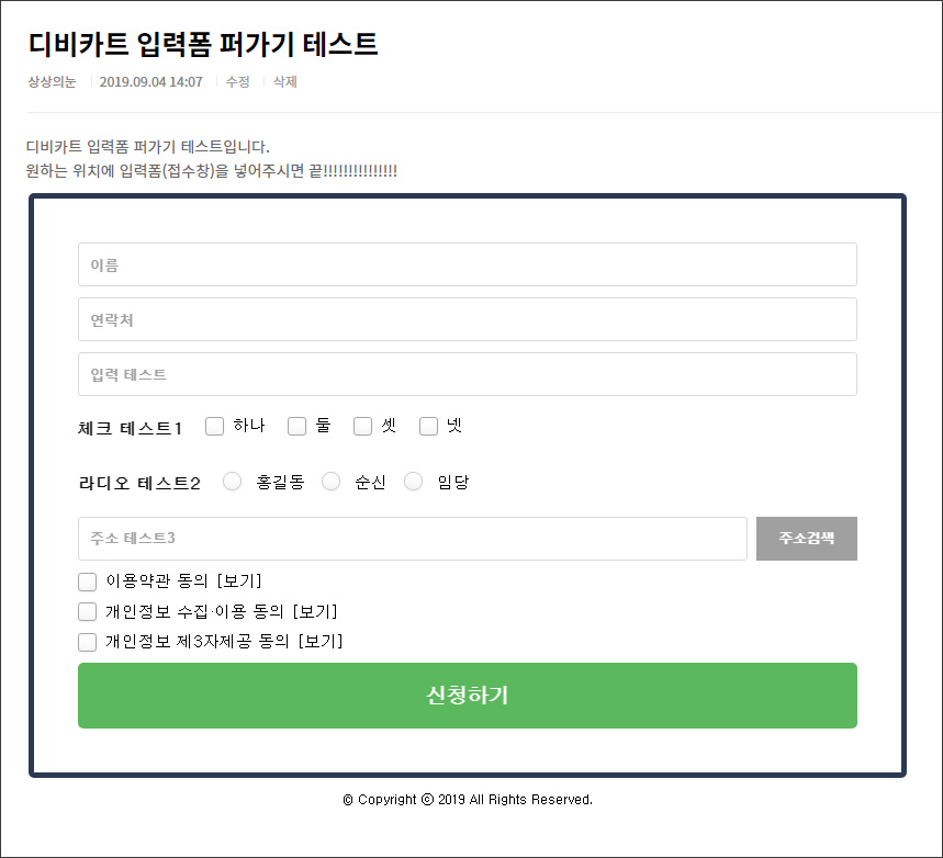 즉 블로그 포스팅시 원하는 위치에 입력폼(접수창)소스를 넣어서 포스팅을 완료하시면
