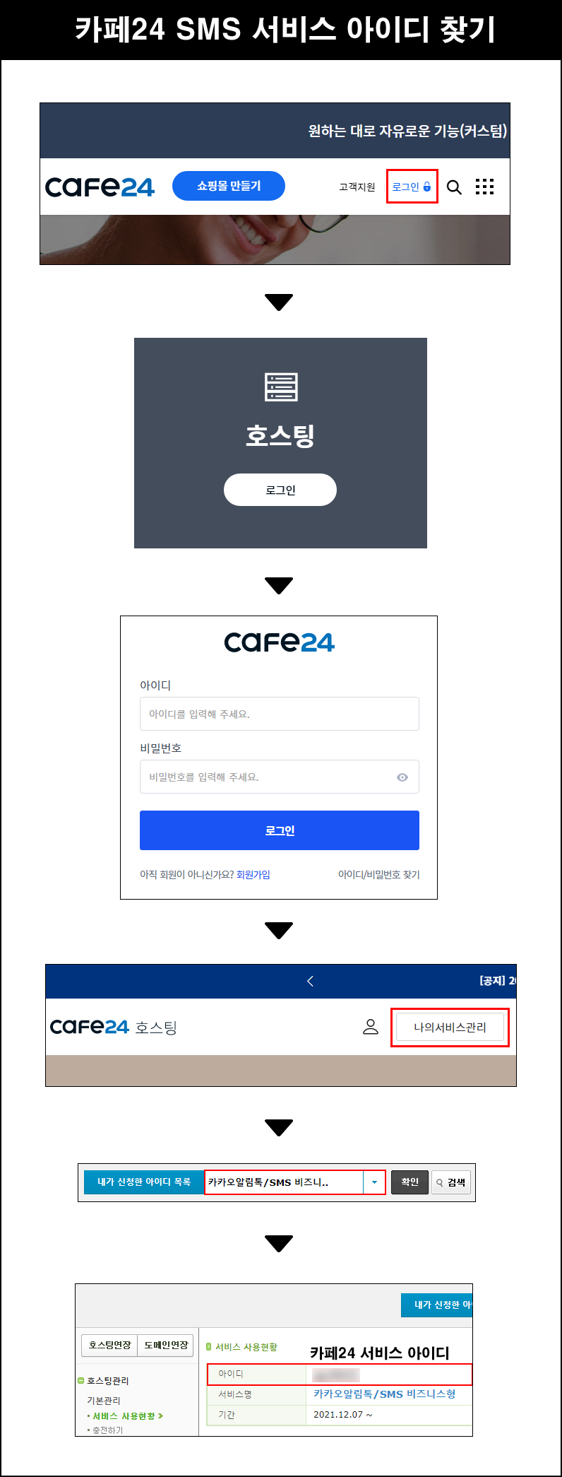 카페24 SMS 서비스 아이디를 찾기 위한 순서를 설명하였습니다.