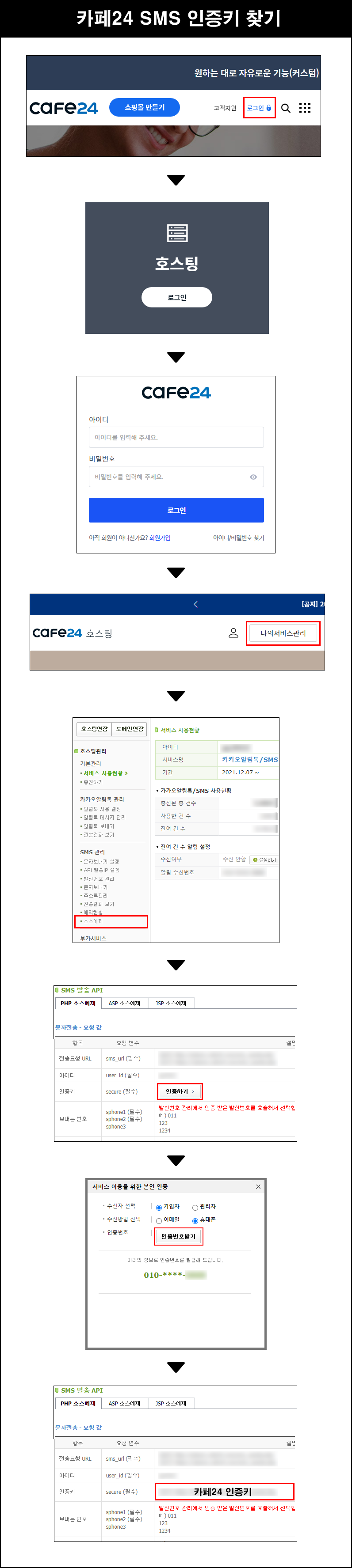 카페24 SMS 인증키를 찾기 위한 순서를 설명하였습니다.