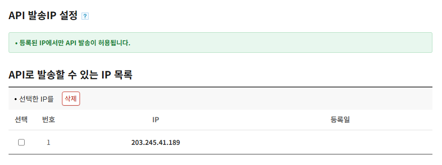 아래와 같이 API 발송 IP를 추가해야 정상적으로 전송이 가능합니다.