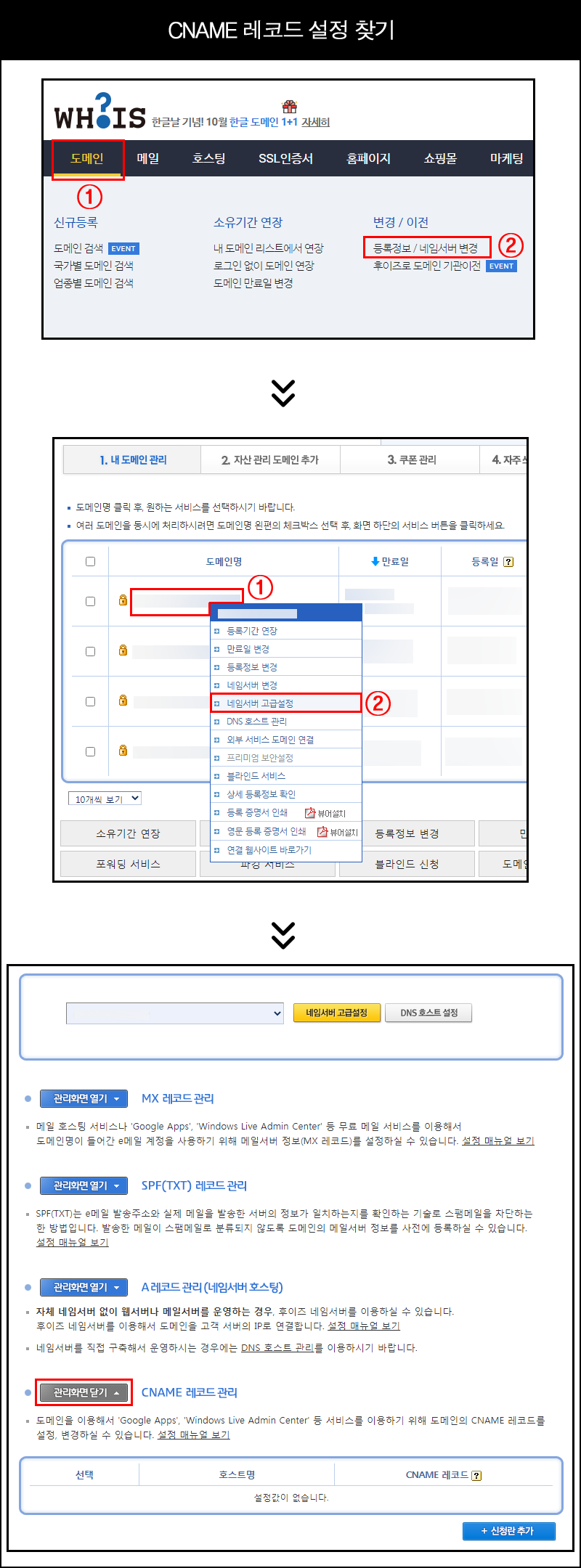 2. 후이즈 CNAME 설정 위치 찾기
