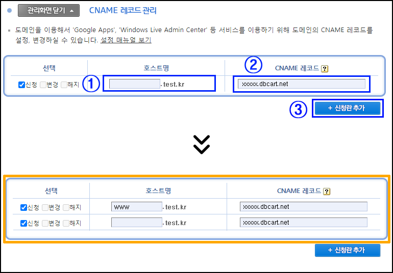 ② CNAME 레코드(연결할 도메인) : xxxxx.dbcart.net