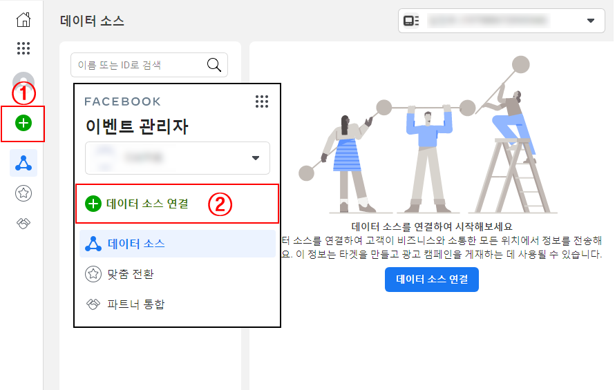 https://www.facebook.com/events_manager2/ 2. 이벤트 관리자 로그인 후 ① 클릭 후 ② '데이터 소스 연결' 선택합니다.