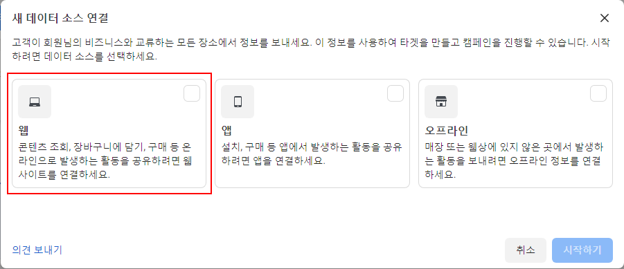 3. 새 데이터 소스 연결하는 창이 뜨며, 픽셀 설치위치가 웹이므로 '웹'을 선택합니다.