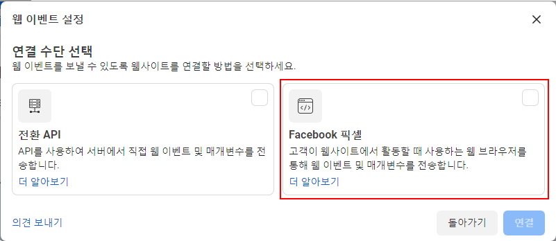 4. 웹사이트 연결수단 'Facebook 픽셀' 선택합니다.
