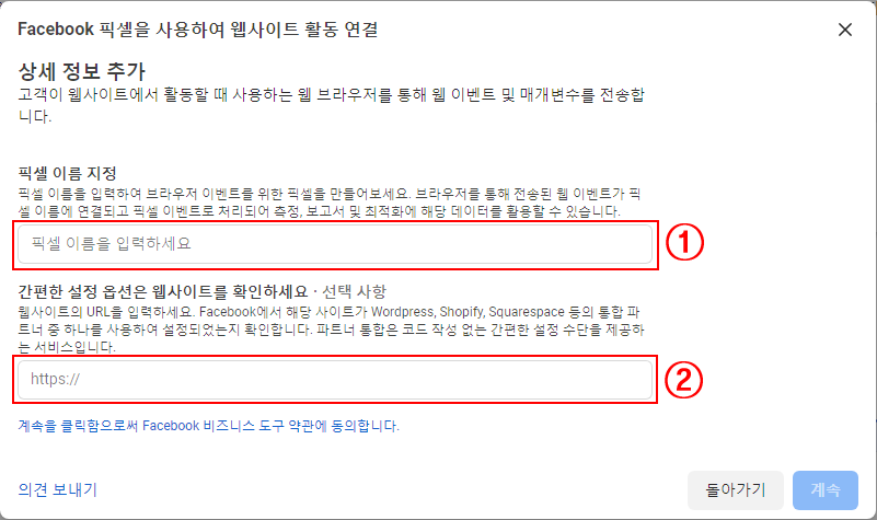 5. 웹사이트 설정 할 픽셀 이름 및 웹사이트 주소를 입력합니다.