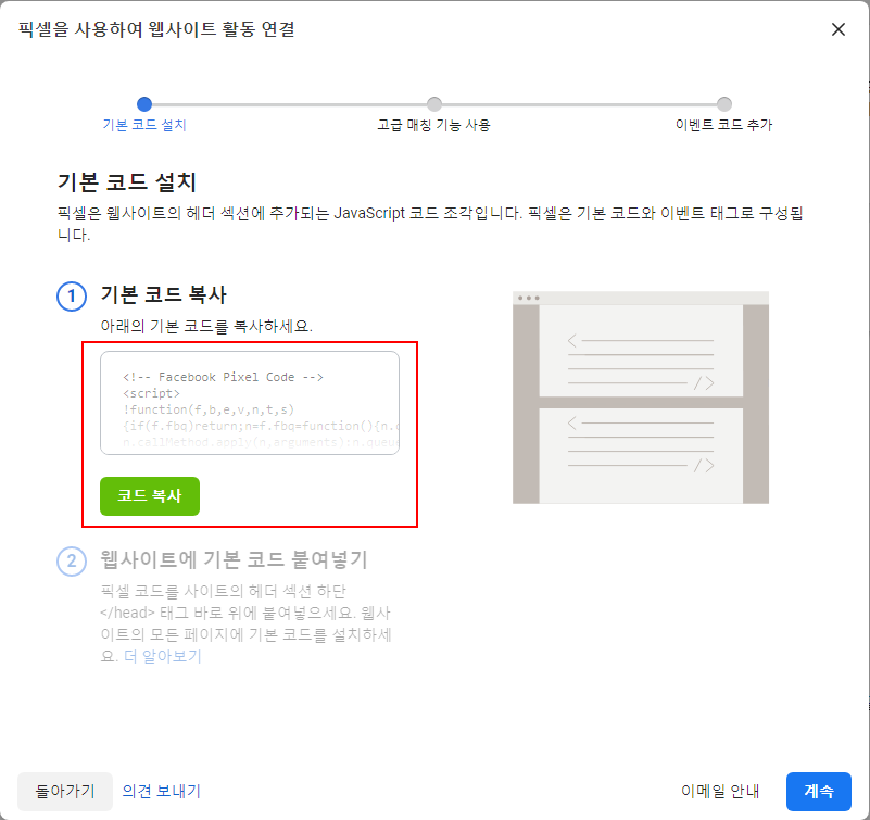 6. 웹사이트에 설치할 픽셀코드가 보여지며, '코드복사' 클릭시 자동으로 코드 복사가 됩니다.