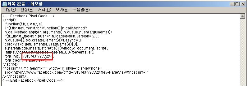 7. 개인 웹사이트에 해당 픽셀을 사용하는 경우 5번에서 추가한 웹사이트 주소 웹소스에 <head>와 </head>사이를 찾아서 복사한 픽셀코드를 붙여넣기(Ctrl+v) 하시면 끝납니다. 7-1. 디비카트 랜딩페이지에 픽셀코드를 사용하는 경우 ■ 메모장에 해당 복사한 픽셀코드를 붙여넣기(Ctrl+v)하면 아래와 같이 픽셀코드가 나옵니다. 붉은색으로 표시된 픽셀ID를 복사합니다.