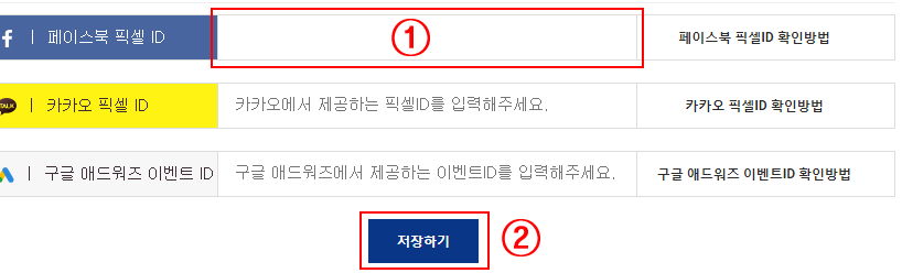 ■ 복사한 픽셀ID를 디비카트에 페이스북 픽셀 관리에 픽셀ID를 입력하고 저장합니다.디비카트 페이스북 픽셀 등록경로 : 랜딩홍보하기 > 픽셀관리 이동하여 ① 픽셀ID 추가 후 ② 저장하기 선택합니다.