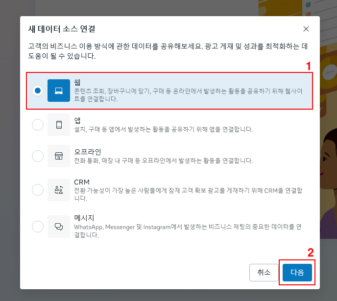 현재 랜딩페이지 픽셀은 '웹'에서 설정하기 때문에 비즈니스 계정 신청이 꼭 필요합니다.