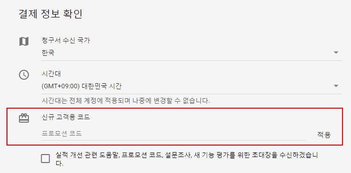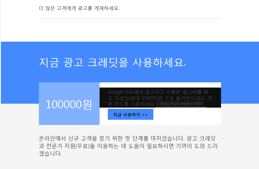 [참고사항] 처음에 '구글 애드워즈 10만원 적립 프로모션' 참여하여 이메일로 코드를 발급 받았습니다.
