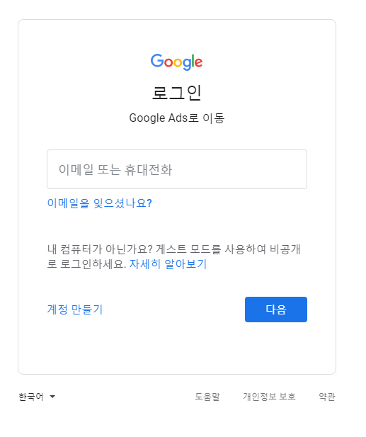 구글 계정이 있는경우 해당 계정으로 로그인하시면 되며, 새로운 광고계정을 사용하시는 경우 회원가입하시면 됩니다.