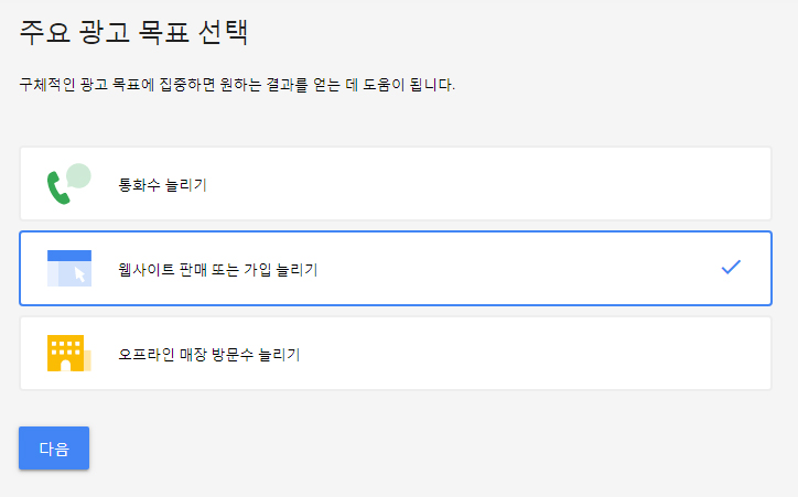 광고목적은 광고를 통해서 랜딩페이지를 노출시켜 디비를 수집받기를 원하기 때문에 '웹사이트 판매 또는 가입늘리기' 선택 하였습니다.