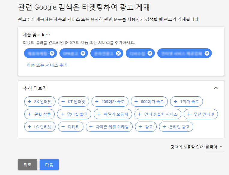 웹사이트에 타겟팅이 될 제품 및 서비스명을 등록해 주세요.