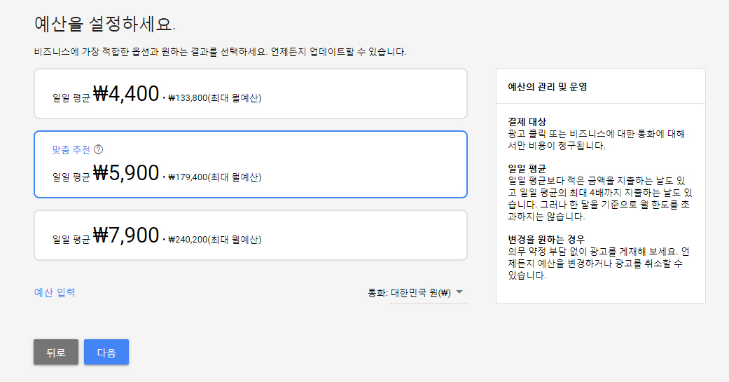 광고를 진행할 일일예산을 선택해 주세요.