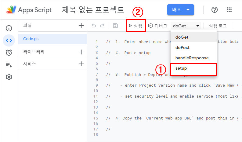 ① 해당 구글 스프레드시트 사용할 배포명(구분하기 위한 설명) 입력합니다.