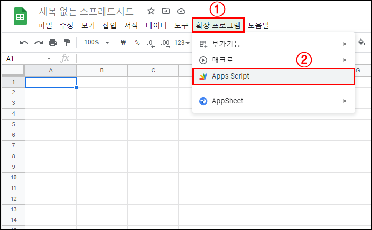 ① 확장 프로그램 > ② Apps Script 를 선택합니다.
