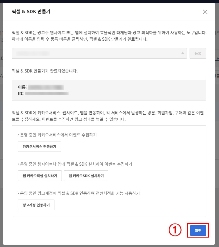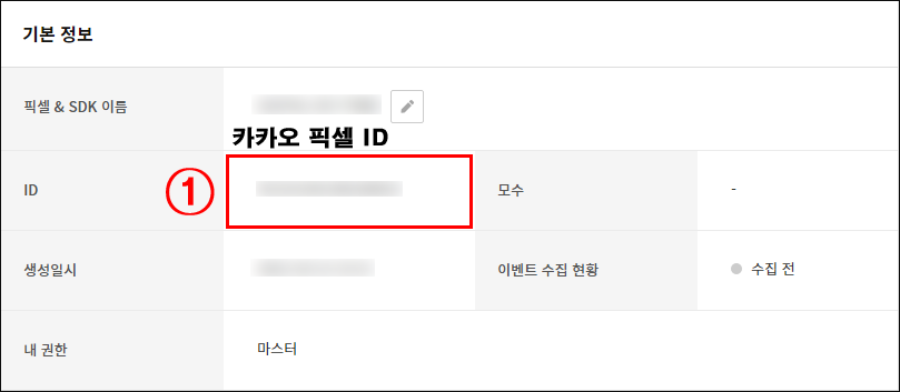 ① 카카오 픽셀 ID를 확인 가능합니다.(숫자로 된 ID 입니다.)