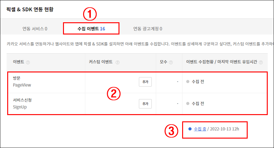 2. ① 선택 -> ② 방문(PageView) 수집전->③ 수집중(일자) 변경 확인