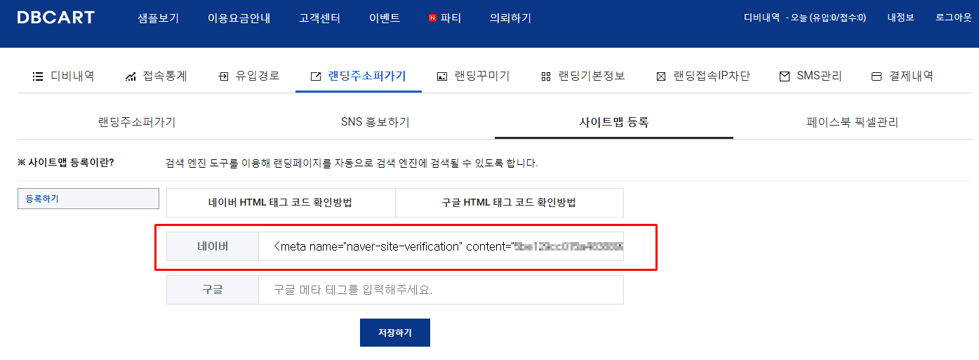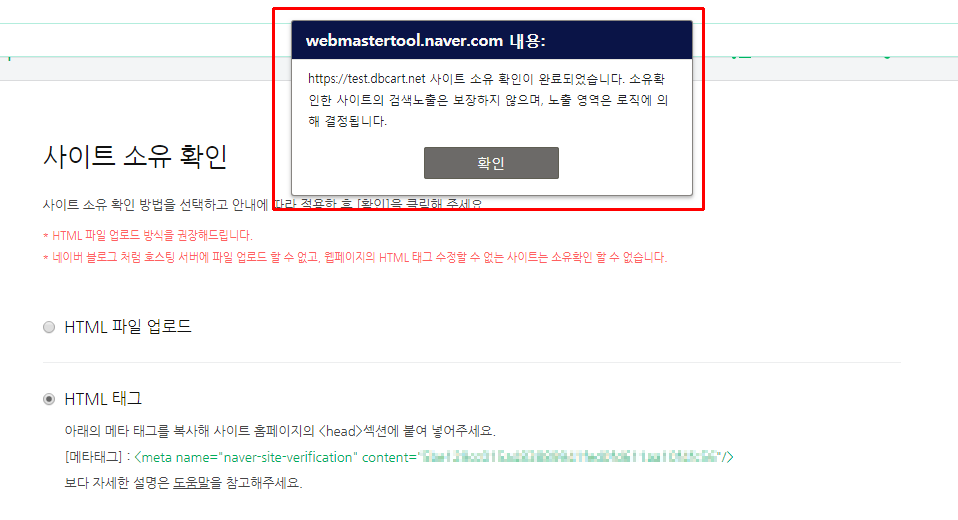 3. 사이트 주소를 입력하면 두번째 항목인 HTML태그를 선택하면 메타태그가 나옵니다. 해당 태그를 복사를 해둡니다. 4. 복사한 메타태그를 새창에 디비카트를 접속하여 디비카트의 랜딩 홍보하기-> 사이트맵등록에서 네이버 메타태그에 복사한 태그를 입력하고 저장합니다. 5. 다시 네이버로 돌아가서 확인을 누르면 등록하기가 완료됩니다. 이렇게 하면