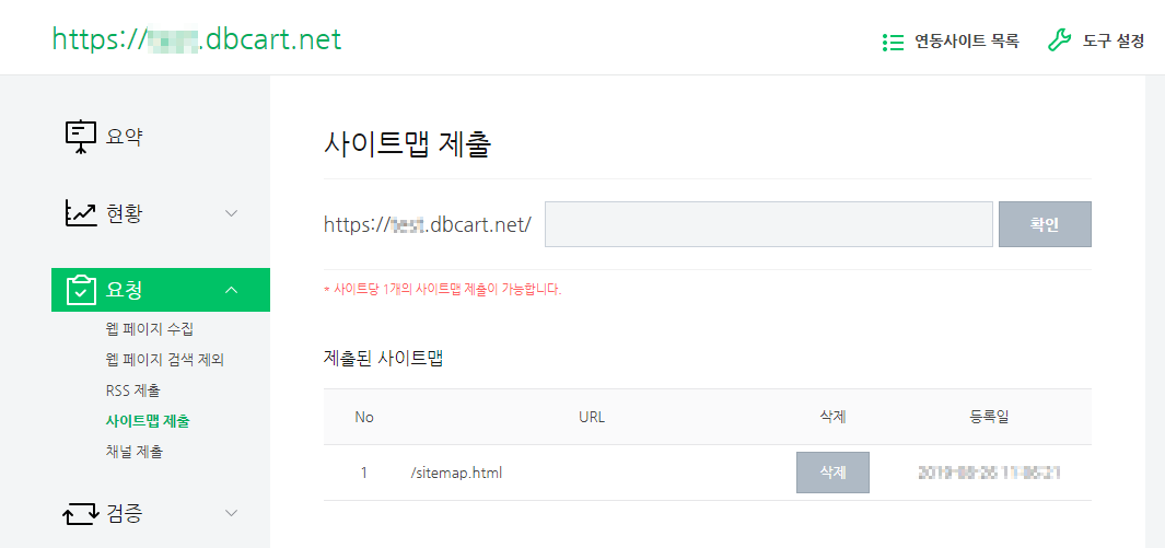 추가적으로 디비카트는 사이트맵 등록이 가능하므로 네이버 웹마스터도구->요청->사이트맵 제출을 통해서 사이트맵을 제출할수 있습니다.