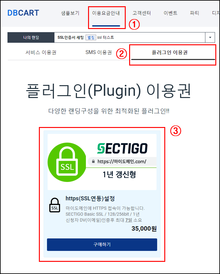 ③ 여러 플러그인중에 'https(SSL연동)설정' 찾아서 (구매하기)를 선택합니다.