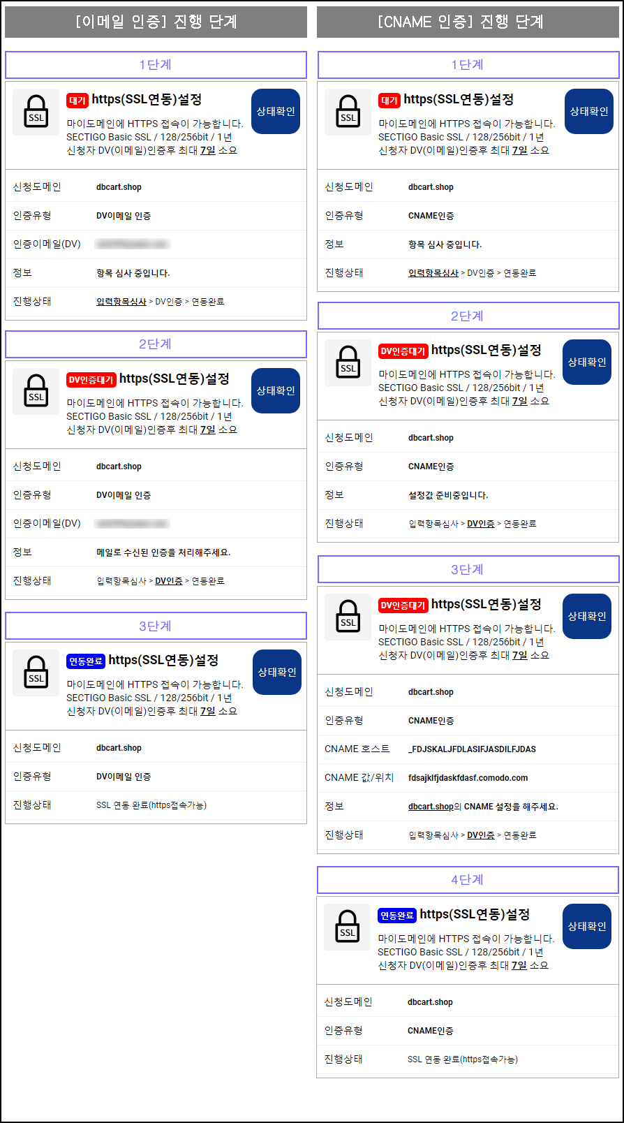(SSL 신청하실때 [이메일 인증]과 [CNAME 인증]에 따라 진행심사 단계가 달라집니다.)