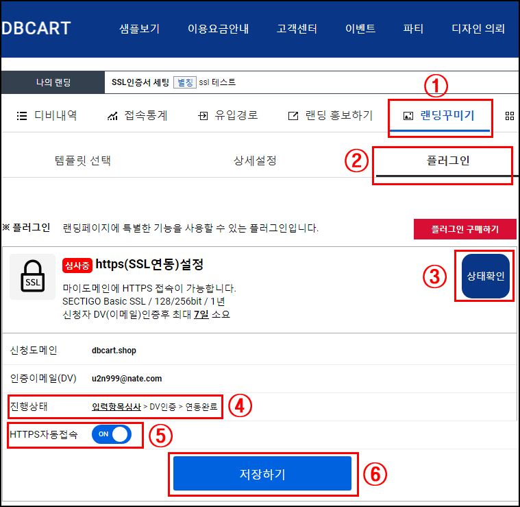 ※ 심사 진행상태 확인 위치 : ① 랜딩꾸미기 > ② 플러그인 > https(SSL연동)설정 > ③ 상태확인